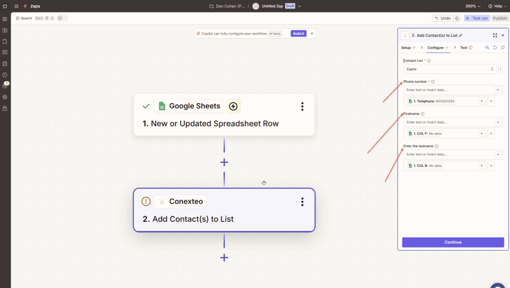 4. Utilisez ce numéro formaté dans l’action Conexteo