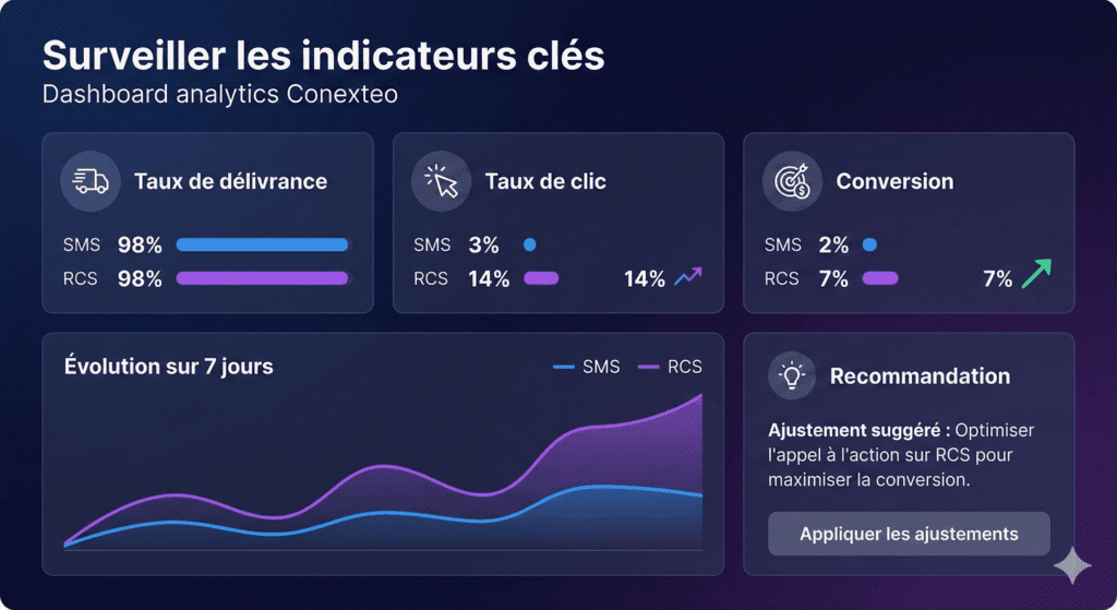 Taux de délivrabilité : Assurez-vous que vos messages arrivent bien à destination, tant en RCS qu’en SMS fallback. Un taux inférieur à 95% mérite investigation.