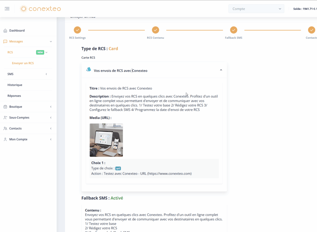L’envoi de messages RCS enrichis pour votre entreprise se fait entièrement en ligne, via une plateforme web intuitive. Avec Conexteo, vous bénéficiez d’une solution unifiée RCS & SMS pour concevoir, personnaliser et lancer vos campagnes SMS 2.0 en quelques clics, sans aucune installation technique. Notre plateforme gère pour vous l’enregistrement de votre marque, la création de contenus interactifs (images, carrousels, boutons d’action) et surtout le fallback automatique en SMS pour une délivrance garantie. Découvrez comment transformer votre communication client dès aujourd’hui.